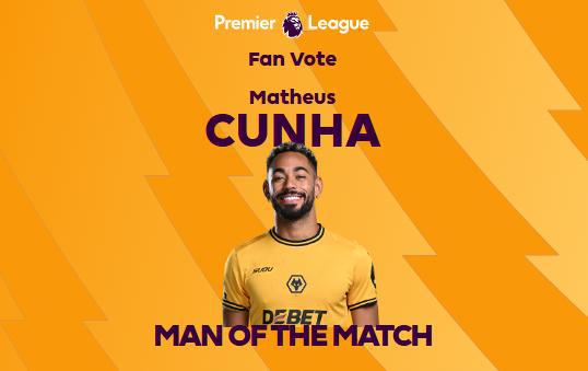 直播吧4月27日讯 英超第34轮,狼队3-0战胜莱斯特城。赛后,库尼亚当选本场比赛最佳球员。